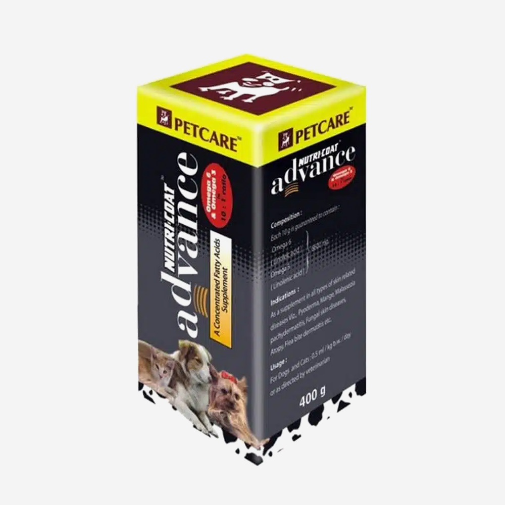 Nutricoat advance from Petcare is rich in omega fatty acids essential for maintaining skin and coat health in dogs and cats. It also contains an exclusive complex of vitamins essential for skin and coat nourishment. Highly palatable. Contains both omega 3 & 6.